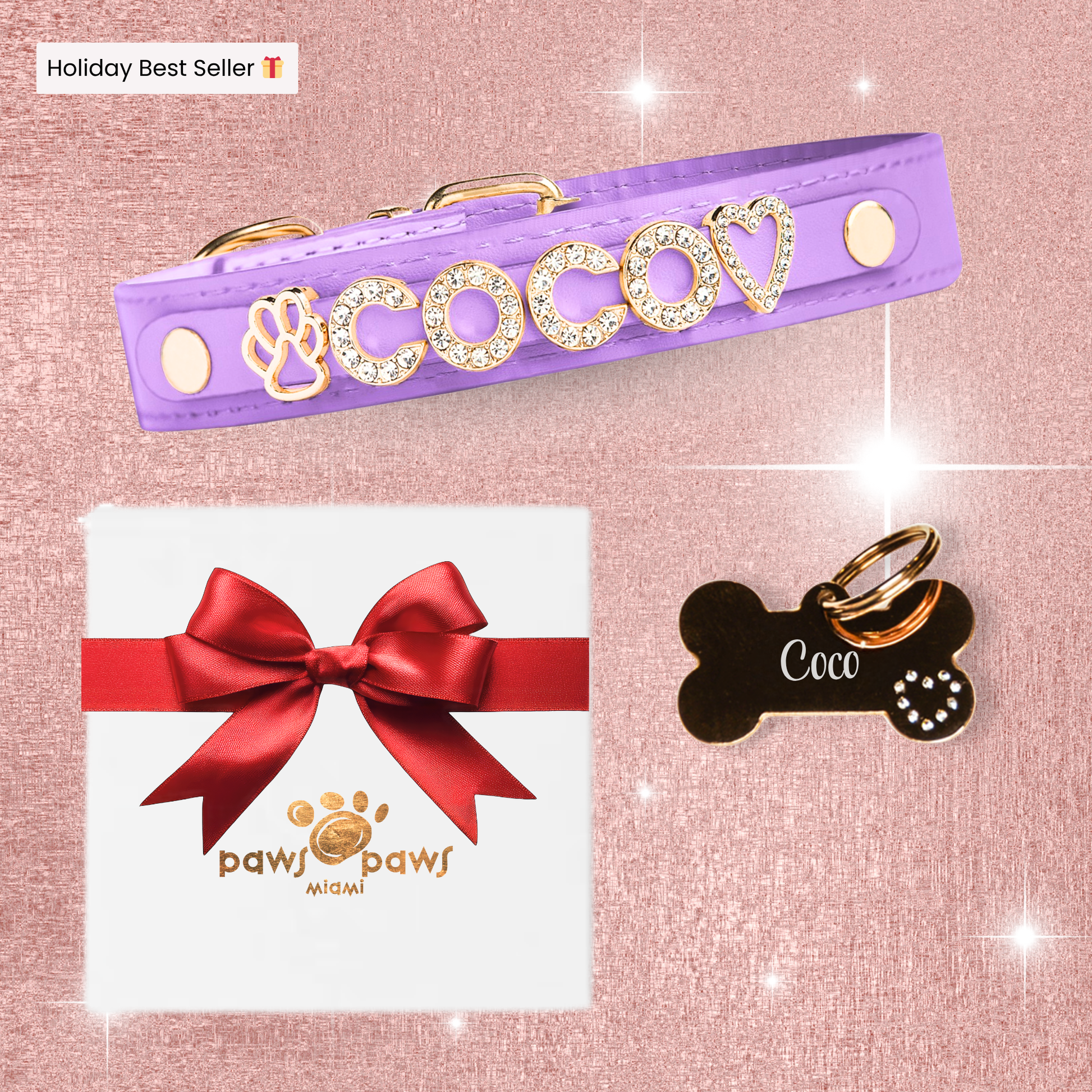 Holiday‑ready gift set that combines sparkle and safety—a custom name collar with matching engraved ID tag, beautifully boxed and ready to gift.